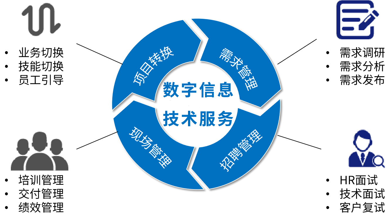 外包服务以行业解决方案为基础,涵盖业务包括需求管理、招聘管理、现场管理、项目转换等软件全生命周期作业或部分作业。